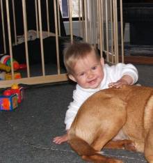 Dear Mary & Stephen, Just thought you might like to see the attached photo of Frankie with Ben & Jackie. She has taken them on just as I hoped she might - she is very protective and gentle around them. If I am at the clothes line or outside and one of the babies wakes up there is almost instantly a gentle prod from an orange nose on my leg to let me know. If we go out for a walk with the pram and another dog or stranger gets too close she is instantly in their way stopping them getting too close to "her" babies, it is lovely.
