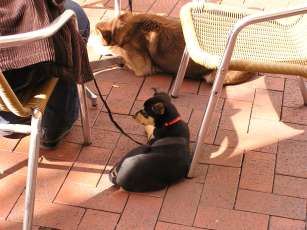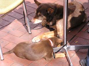 Noonbarra Mou with Flo being well behaved at a coffee shop in Italy
