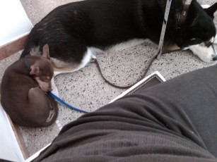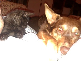 In this picture, Mou sleeps with a new entry: Bianca (black kitten). They are friends, Mou loves her very much