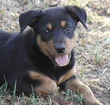 "He is turning out to be a fantastic and loving dog – all at 13 weeks of age. He follows us everywhere, through the paddocks, down the road etc. He gets very upset when either of us goes out in the car without him. He has been meeting numerous other dogs and people and now greets all in an appropriate manner. His best friend is a very large mixed breed “pig” dog possessed by the non-resident owner of the block next door. This dog weighs around 50kg and Gus has to climb the 4 steps to our back verandah to be at eye level with him when he is at ground level – it is an amazing sight and they are the best of mates after having been “formally” introduced. The pig dog jumps all gates & fences to get to Gus and play.