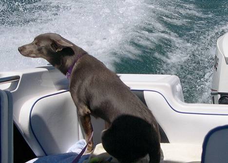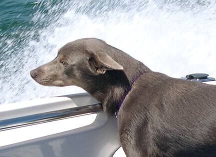 "These photos were taken on Lake Macquarie. .. Meg has had her second trip out in the boat. I've attached a couple of photos to show you how much she enjoyed it. She is still not too sure about that outboard motor when the throttle is open but you will see from one of the photos that she still wanted to be looking over the side with the wind in her face so she is learning to put up with the noise. I'm sure she will feel more confident about the engine noise the more exposure she has to it.