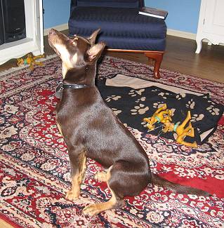 "We've been training him and have found that he is a really fast learner. He knows sit, is learning stay, knows to sit outside an open door and not barge in (most of the time), and has recently learned 'up' and 'off'. We've got a large cardboard crate which has collapsed a bit. He loves to climb 'up' and then slide on his bottom 'off'.