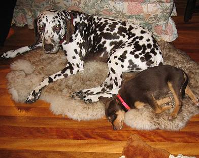 "Meanwhile, Femme has fallen in love with an older male, namely my son Andrew's Dalmatian Zel. After a shaky start they are now inseparable and it has been a boon to Femme to have an older well trained dog to learn the ropes from. Andrew is very good at training animals (he must be to get an obedient Dalmation) and he works from my home, so that has been a blessing."