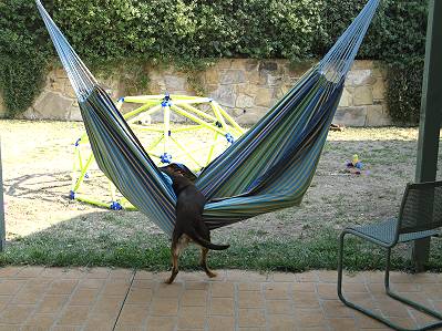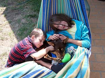 Milo has become a great friend for both our kids. They play with him for ages. Milo is very tolerant and puts up with a lot. The photos show him having a cuddle with the kids in the hammock, and playing with Conor. His favourite toy is the soccer ball. He can play on his own or with people.