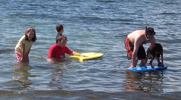 Over Christmas we took him on holiday to Lake Macquarie. He travelled well in his crate. A tip for future visits is to not feed wet food before a long drive - the wind coming from the crate was rather unpleasant. Milo had his first experience of water. He loved the water but didn't like going in over his head. One of the photos shows him 'surfing' on a boogy board.