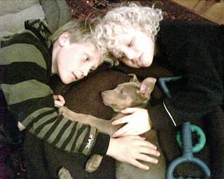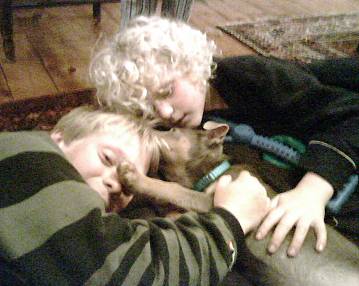 "Cricket in his new bed with Ted and Finn. He is so relaxed, we just adore him. People everywhere we went today admired him. Thankyou so much. Much love will Kate Rup Ted and Finn."