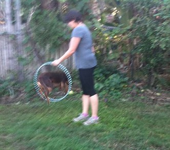 Also, she is absolutely loving doing tricks, like jumping through hula hoops and our arms, (not too high off the ground though yet) When we pick up the hula hoop, she comes running, all excited! & I have taught her to jump 'in' the shell pool, then 'out' and now she does it even if there is water in - We do a little obstacle course around the garden. I am going to set up the kids old play tunnel & some broom handles this weekend - & extend the makeshift obstacle course! the girls really enjoy doing this with Peg as well. She responds really well to the girls now too, and even little Tilly - who just copies exactly what we say, so that's probably why!