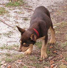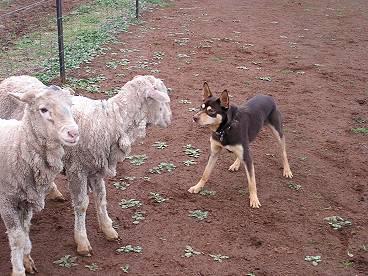 He's spent a little time helping the big girls with the sheep. Both girls are on heat at the moment, and even at 10 weeks, Kell seems to know what he'll be able to do a little later down the track. They smell really nice, and he's got the hip movement up against the back leg thing going too. All in all, we are delighted with him. We'll keep in touch. Leanne