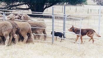 Noonbarra Mac with Noonbarra Dusty III pushing sheep