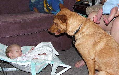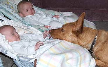 Dear Mary & Stephen, Just thought you might like to see the attached photo of Frankie with Ben & Jackie. She has taken them on just as I hoped she might - she is very protective and gentle around them. If I am at the clothes line or outside and one of the babies wakes up there is almost instantly a gentle prod from an orange nose on my leg to let me know. If we go out for a walk with the pram and another dog or stranger gets too close she is instantly in their way stopping them getting too close to "her" babies, it is lovely.