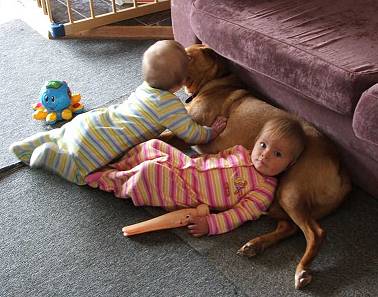 "She is constantly trying to get the horses to play with her but they cannot work out what she is up to. And the twins continue to use her as a pillow at every opportunity. She is so even-tempered with them, they cannot seem to make her mad no matter what games they come up with. It is an absolute joy to watch them all playing together and a wonderful credit to you and the dogs that you are breeding.