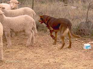 "The sheep then handled nicely on their way to the corral. I was horseback because I want Pedro to get used to me being fast along with him. The only time I put a leash on him was just as we were nearing the corral gate so I could keep him alongside of me and I made him lie down in the gate after the sheep went in. I let Pedro come in the drench pen with me and the lambs. He kept them crowded for me. For a time, Pedro stood on his hind feet with his front paws on the lambs' backs. He will down for me around the house, but on the sheep he didn't down, so I talked to him calmly "there" when he held a good position".