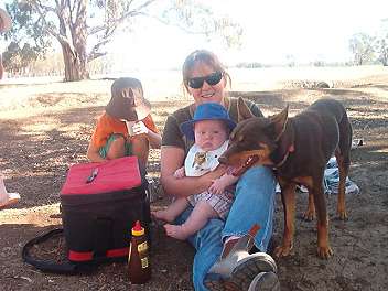 We just got back last night from a two week holiday and Ruby had a great time she really enjoyed having all those friends she had a little go with the sheep and really enjoyed herself she loved going on the back of the ute as you see in the photo. There was no worries of her jumping off as she waited for me to lift her down (or anyone that was free at the time) she really likes Neil a lot and was happy following him around as well. The girls loved all those dogs to take care of and play with as you can see Emily is under all those Kelpies. and once again Ruby travelled very well it was a big day in the car with no complaining from her.