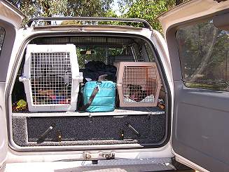 Noonbarra Dusty IV and Noonbarra Tilly travel in comfortable crates