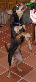 We decided to try to teach her to walk on 2 legs. She really seems to be a natural at it. We still need to hold up treats for her to do it, but she's increasing the time she stays up almost every day, and she's definitely got the point now. To start off with, the hardest was keeping her from jumping up. Hopefully soon she'll do it without the treat as well. "